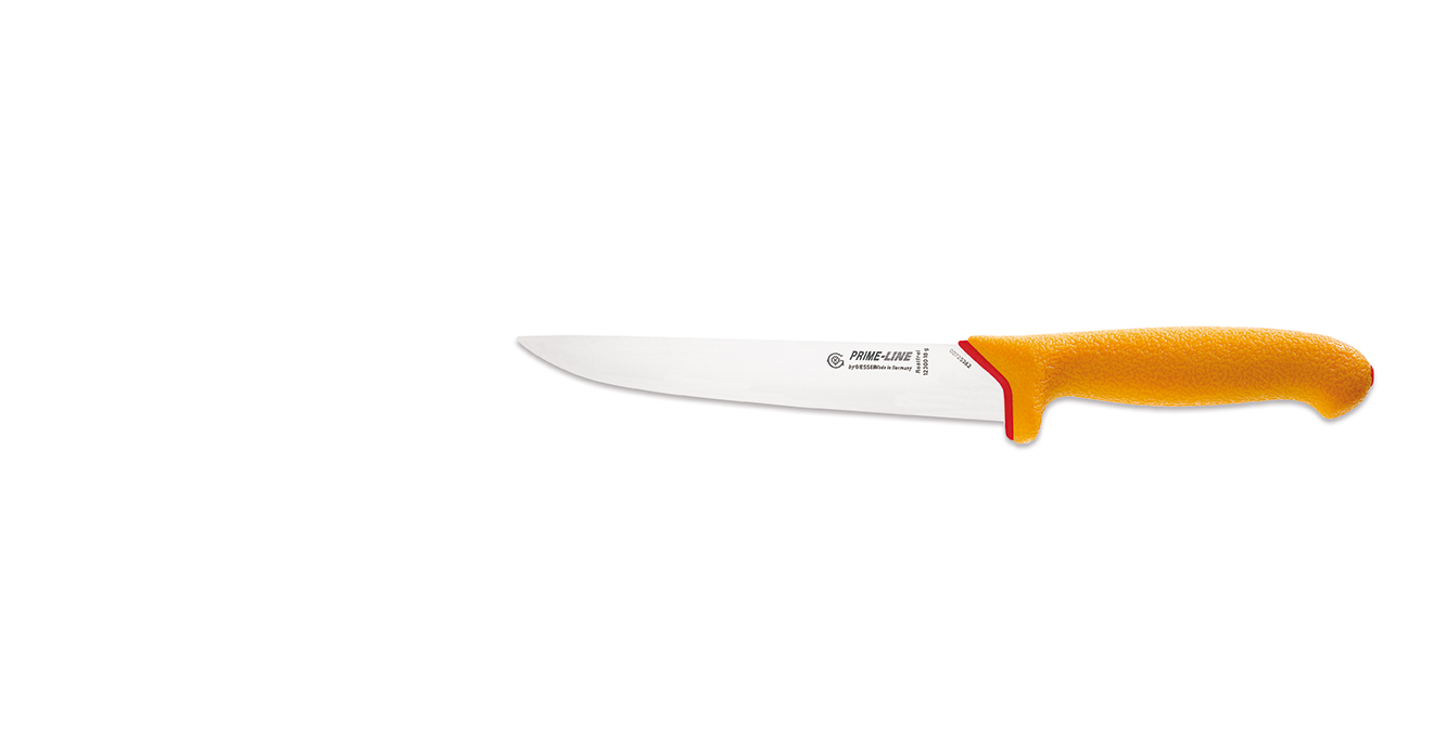 Nůž řady Prime Line, vykrvovací, pevný. Ergonomická uzavřená rukojeť s vnitřním pevným jádrem a povrchem z měkčeného antibakteriálního materiálu. Řada PrimeLine patří k nejoblíbenějším a nejprodávanějším řeznickým nožům z našeho sortimentu. Nože řady Prime Line jsou označeny z výroby jedinečným číselným kódem kvůli identifikaci.