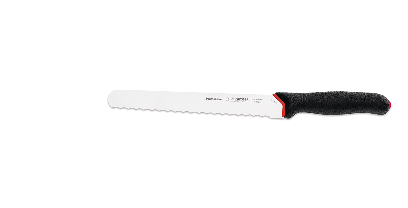 Nůž řady Prime Line, salámový se zvlněným ostřím. Ergonomická uzavřená rukojeť s vnitřním pevným jádrem a povrchem z měkčeného antibakteriálního materiálu. Řada PrimeLine patří k nejoblíbenějším a nejprodávanějším řeznickým nožům z našeho sortimentu. Nože řady Prime Line jsou označeny z výroby jedinečným číselným kódem kvůli identifikaci.